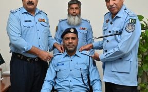 ایس پی ایوان صدر فضل عباس شاہ صاحب اور ڈی ایس پی اکرام الحق صاحب نیو پروموٹ ہونے والے اے ایس آئی جاوید مسعود کو رینک لگا رہے ہیں