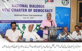 اسلام آباد () پاکستان فیڈرل یونین آف جرنلسٹس (پی ایف یو جے )،نیشنل پریس کلب اور پاکستان ڈویلپمنٹ الائنس کے زیر اہتمام پاکستان کی تمام سیاسی جماعتوں کے درمیان گھٹن زیادہ ماحول میں مکالمے کی روایت کو برقرار رکھنے کے لیے نئے میثاق جمہوریت کے حوالے سے منعقدہ قومی ڈائیلاگ سے خطاب کرتے ہوئے مقررین […]