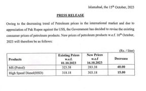 اسلام آباد پٹرول کی نئی قیمت 283 روپے 38 پیسے فی لیٹر مقرر، نوٹیفیکیشن ڈیزل کی نئی قیمت 308 روہے 18 ہیسے فی لیٹر مقرر، نوٹیفیکیشن مٹی کے تیل کی نئی قیمت 214 روپے 85 پیسے فی لیٹر مقرر، نوٹیفیکیشن