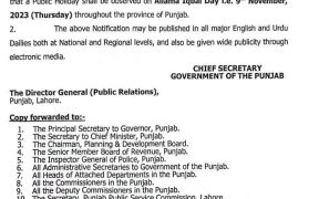 لاہور 9 نومبر کو پنجاب میں بھی عام تعطیل ہو گی’ وفاقی حکومت کے بعد پنجاب حکومت نے نوٹیفکیشن جاری کر دیا