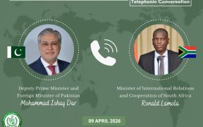 اسلام آباد (سہ پہر) نائب وزیرِ اعظم،وزیرِ خارجہ سینیٹر محمد اسحاق ڈار نے آج جنوبی افریقہ کے وزیر برائے بین الاقوامی تعلقات و تعاون، رونالڈ لامولا کے ساتھ ٹیلیفون پر گفتگو کی۔دونوں رہنماں نے مشرقِ وسطی اور وسیع تر خطے میں ہونے والی تازہ پیش رفت پر تبادلہ خیال کیا۔ وزیر لامولا نے عارضی جنگ […]