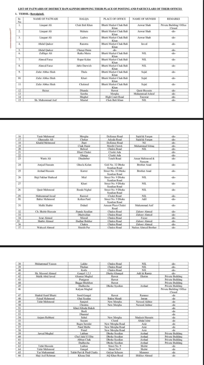 اسلام آباد (سہ پہر) لاہور ہائی کورٹ راولپنڈی بینچ کا محکمہ انسداد رشوت ستانی کو راولپنڈی ضلع میں پرائیویٹ منشی رکھنے والے پٹواریوں کی لسٹیں تیار کرنے کا حکم
