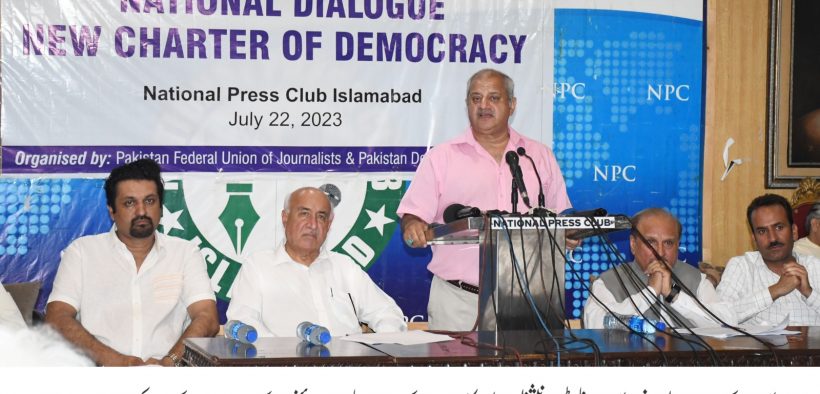 اسلام آباد(سہ پہر) پاکستان فیڈرل یونین آف جرنلسٹس (پی ایف یو جے )،نیشنل پریس کلب اور پاکستان ڈویلپمنٹ الائنس کے زیر اہتمام پاکستان کی تمام سیاسی جماعتوں کے درمیان گھٹن زیادہ ماحول میں مکالمے کی روایت کو برقرار رکھنے کے لیے نئے میثاق جمہوریت کے حوالے سے منعقدہ قومی ڈائیلاگ
