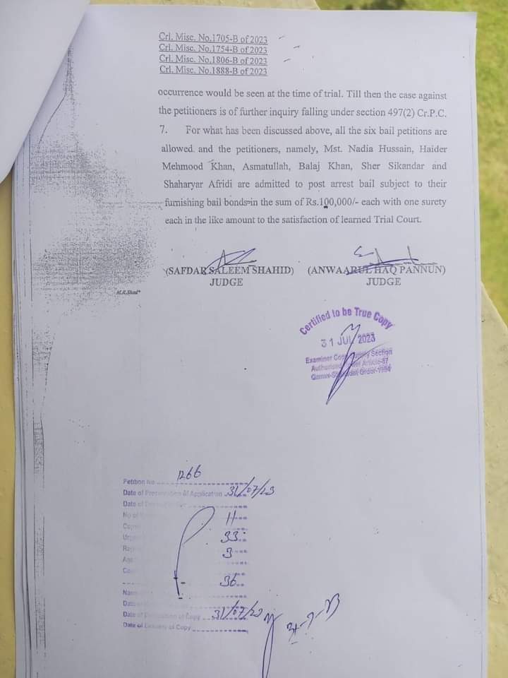 9 مئی کو جی ایچ کیو حملے میں نہ کوئی زخمی ہوا، نہ کوئی آرمی آفیسر مدعی بنا۔ جی ایچ کیو کے اندر اور باہر سی سی ٹی وی کیمروں کو بھی قبضے میں نہیں لیا گیا، شناخت پریڈ کے دوران فوج کے کسی ملازم کو شامل نہیں کیا گیا نہ کوئی گواہ ہے، جی ایچ کیو مقدمے میں کسی خاتون کو نامزد نہیں کیا گیا۔ موقع پر موجود پولیس افسران نے مظاہرین کو جی ایچ کیو کے اندر جانے سے بھی نہیں روکا. بادی النظر میں انسداد دہشتگردی ایکٹ کی دفعہ 7 کا اطلاق نہیں پایا جاتا، ملزمان کے خلاف مقدمہ مزید تحقیقات کا محتاج نہیں اور ملزمان کو جیل میں رکھنے کا بھی کوئی جواز نہیں، عدالت
