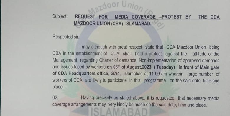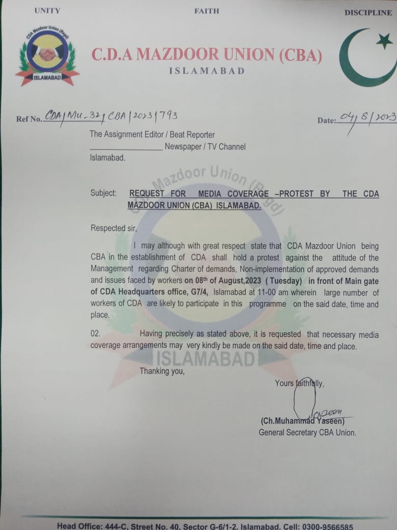 سی ڈی اے مزدور یونین(سی بی اے)چوہدری محمد یاسین گروپ کی ایگزیکٹو کونسل کا اجلاس مورخہ آٹھ اگست بروز منگل بوقت صبح 10 بجے مین چیئرمین آفس سیکٹر G-7/4