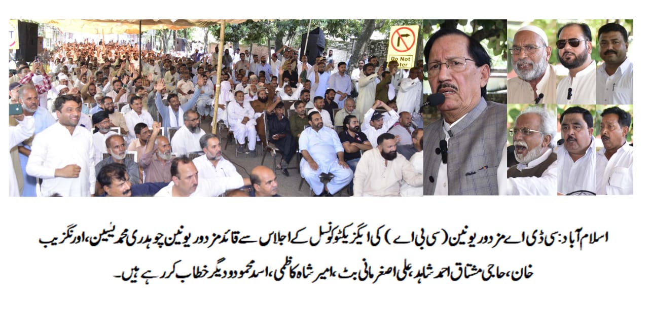 سی ڈی اے مزدور یونین(سی بی اے)چوہدری محمد یاسین گروپ کی ایگزیکٹو کونسل کا اجلاس اورنگزیب خان کی زیر صدارت مرکزی چیئرمین آفس سیکٹرG-7/4 میں منعقد ہوا جس میں سی ڈی اے مزدور یونین کے جنرل سیکرٹری چوہدری محمد یٰسین،راجہ شاکر زمان کیانی،صوفی محمودعلی،حاجی راجہ صابر،سردارمحمد آصف،علی اصغر مانی بٹ،سید مقبول حسین شاہ،حاجی مشتاق احمد شاہد،مرزاسعیداختر،چوہدری زاہد احمد،راجہ رئیس،ملک خلیل،چوہدری واجد گجر،چوہدری ابرار،سید امیرشاہ کاظمی،محمد سرفرازملک،اسدمحمود،سردارنسیم ممتاز،چوہدری طارق گجر،صفدرعباسی،راجہ غلام مرتضیٰ،وارث دلیپ،چوہدری ارشد سمیت تمام مرکزی عہدیداران،سی بی اے کمیٹیز کے نمائندگان اورہزاروں ملازمین نے کثیر تعداد میں شرکت کی،اجلاس میں ملازمین کے پلاٹوں کی الاٹمنٹ کے حوالے سے سمری کی منظوری،چارٹر آف ڈیمانڈ کی منظوری،ملازمین کے بچوں کی بھرتی،اوورٹائم کی منظوری،ہفتہ وار چھٹی کی بحالی،اناملی کمیٹی کے فیصلوں پر عمل درآمد سمیت دیگر مسائل پر غور و غوص کیاگیا،اجلاس سے خطاب کرتے ہوئے سی ڈی اے مزدور یونین کے صدر اورنگزیب خان و دیگر عہدیداران نے انتظامیہ کے غیر قانونی اور غیر مناسب رویے کی مذمت کرتے ہوئے کہا کہ سی ڈی اے مزدور یونین مزدوروں کی نمائندہ تنظیم ہے جو قانون کے مطابق اور مزدوروں کے ووٹ کی طاقت سے جمہوری طریقے سے منتخب ہوئی ہے لیکن ادارے کے اندر مزدوروں کی نمائندہ تنظیم کو نظراندازکیا جا رہا ہے اور کسی بھی قسم کی ملازمین کے مسائل پر کوئی مشاورت نہیں کی جا رہی ہے انتظامیہ من مرضی سے غیر قانونی فیصلے کر رہی ہے اور حال ہی میں انوائرمنٹ اور سینی ٹیشن ڈائریکٹوریٹ کے ملازمین کی ہفتہ وارچھٹی ختم کر کے لیبرقوانین اور عالمی ادارہ محنت کے کنونشزکی کھلم کھلاخلاف ورزی کی ہے اس اقدام سے مزدوروں میں سخت بے چینی پائی جاتی ہے اور اوقات کار سے زائد کام لینے کے باجود کسی قسم کی کوئی مراعات و سہولیات نہیں دی جاتیں ہیں،اجلاس سے خطاب کرتے ہوئے سی ڈی اے مزدور یونین کے جنرل سیکرٹری جنرل سیکرٹری چوہدری محمد یٰسین نے کہا کہ سی ڈی اے مزدور یونین ملازمین کی نمائندہ تنظیم ہے اور مزدوروں کے حقوق کا تحفظ ہماری سیاسی،اخلاقی اور مذہبی ذمہ داری ہے،میں تمام عہدیداران اور مزدوروں کے جذبات کی قدرکرتاہوں اور دکھ اورافسوس کا مقام ہے کہ سی ڈی اے میں لاقانونیت کی انتہا ہے اورچیئرمین سی ڈی اے،بورڈ ممبران و دیگرافسران مزدوروں کے مسائل پر عدم دلچسپی کا مظاہرہ کر رہے ہیں جس سے مزدوروں میں نفرت بڑھ رہی ہے،ادارے کو ان ملازمین نے اپنا خون دے کر ترقی کی طرف گامزن کیا ہے اور بین الاقوامی سطح کا شہر بناکر مثال قائم کی ہے لیکن مزدوروں کو انکی خدمات پر کسی قسم کی کوئی مراعات نہیں دی جارہی ہیں،ہمارامقصد مذاکرات کے ذریعے مزدوروں کے مسائل حل کرنا ہے لیکن انتظامیہ مذاکرات کو ہماری کمزوری نہ سمجھے،انھوں نے کہا کہ سی ڈی اے انتظامیہ سات دن کے اندر سی بی اے کے ساتھ مذاکرات کے ذریعے مسائل اور مطالبات پر فوری طور پر میٹنگ بلائے تاکہ ملازمین میں پائی جانے والی بدامنی اور بے چینی کا خاتمہ ہو سکے اور شہر کا صنعتی امن قائم رہ سکے،اگر انتظامیہ نے عدم دلچسپی کا مظاہرہ کیا تو سی ڈی اے مزدور یونین ہزاروں ملازمین کے ساتھ چیئرمین آفس کا گھیراؤکے ساتھ بھرپور احتجاج کرے گی جس کی تمام ترذمہ داری سی ڈی اے انتظامیہ پر ہو گی۔