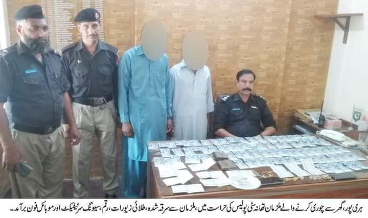 According to the details, Haripur Police Station City Police’s successful operation, the accused who stole from the house of TIP Mohalla Alamabad were arrested. Stolen savings certificates worth more than 45 lakhs, gold ornaments worth more than 25 lakhs, money amounting to Rs.80 thousand and mobile phones were recovered from a house in the limits of Police Station City Chowki TIP in Mohalla Alamabad dated 02.08.2023. The incident of theft took place. A case was registered against the accused under Section 380.34 of the Pakistan Penal Code on the report of the plaintiff Alam Zeib Khan son of Aurangzeb Khan Sakna Mohalla Alamabad. DPO Haripur Muhammad Umar Khan took notice of the incident. SP HQ Muhammad Sajjad and SHO Police Station City Cadet Chanzeb issued orders to trace and arrest the accused involved in the incident and recover the stolen gold ornaments and other goods. In the case of IP Mohammad Ejaz and other police officers, the accused involved in the incident, Muhammad Adil, son of Muhammad Saleem Sakna Mohalla, Asifabad and Muhammad Yusuf, son of Maqbool Rahman Sakna Makhan village, were arrested and robbed on modern scientific and technical basis. Savings certificates worth more than 45 lakhs, gold ornaments worth more than 25 lakhs, money amounting to 80 thousand rupees and a mobile phone were recovered. The accused was brought before the court from which 01 day police custody was granted. Further investigation is going on in the case.