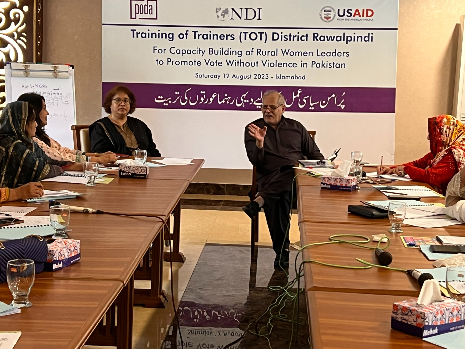 تربیت کے شرکاء کو خوش آمدید کہتے ہوئے ادارہ پودا کی بانی اور صدر محترمہ ثمینہ نذیر نے کہا کہ ‘خواتین کے آزادیء رائے کے حق کو تسلسل سے فروغ دینے کے لئے اس بات کو یقینی بنانا ہوگا کہ اپنے اس حق کو خواتین آزادانہ اور بے خوفی سے سر انجام دے سکیں تاکہ ملک میں جمہوری عمل اپنی جڑیں مضبوطی سے قائم کر سکے۔ ملک کی آدھی آبادی کو اس عمل میں شفافیت سے شامل کئے بغیر حقیقی جمہوریت کا قیام نا ممکن اور نامکمل ہے’۔ پاکستان کے منصوبہ تشدد سے پاک ووٹنگ کے سلسلے کی دوسری ToT آج اسلام آباد میں منعقد کی گئی۔ اس ٹریننگ میں ضلع راولپنڈی کی مختلف تحصیلوں سے18 خواتین نے شرکت کی۔ یہ خواتین ضلع بھر کی سطح پر خواتین کے آزادیء رائے کے استحکام اور خواتین کے دیگرحقوق کی فراہمی کے لئے سرگرم عمل ہیں۔ان میں وکلا، سیاسی کارکن، سماجی کارکن، طلبہ،اساتذہ، رضاکارانہ طور پرخدمت عامہ کرنے والی خواتین اور ریڈیو پر معاشرتی اور علاقائی مسائل پر پروگرام کرنے والی خواتین شامل رہیں۔ یہ سلسلہ تربیتNDI-USAID کے تعاون سے منعقد کی جا رہی ہیں۔