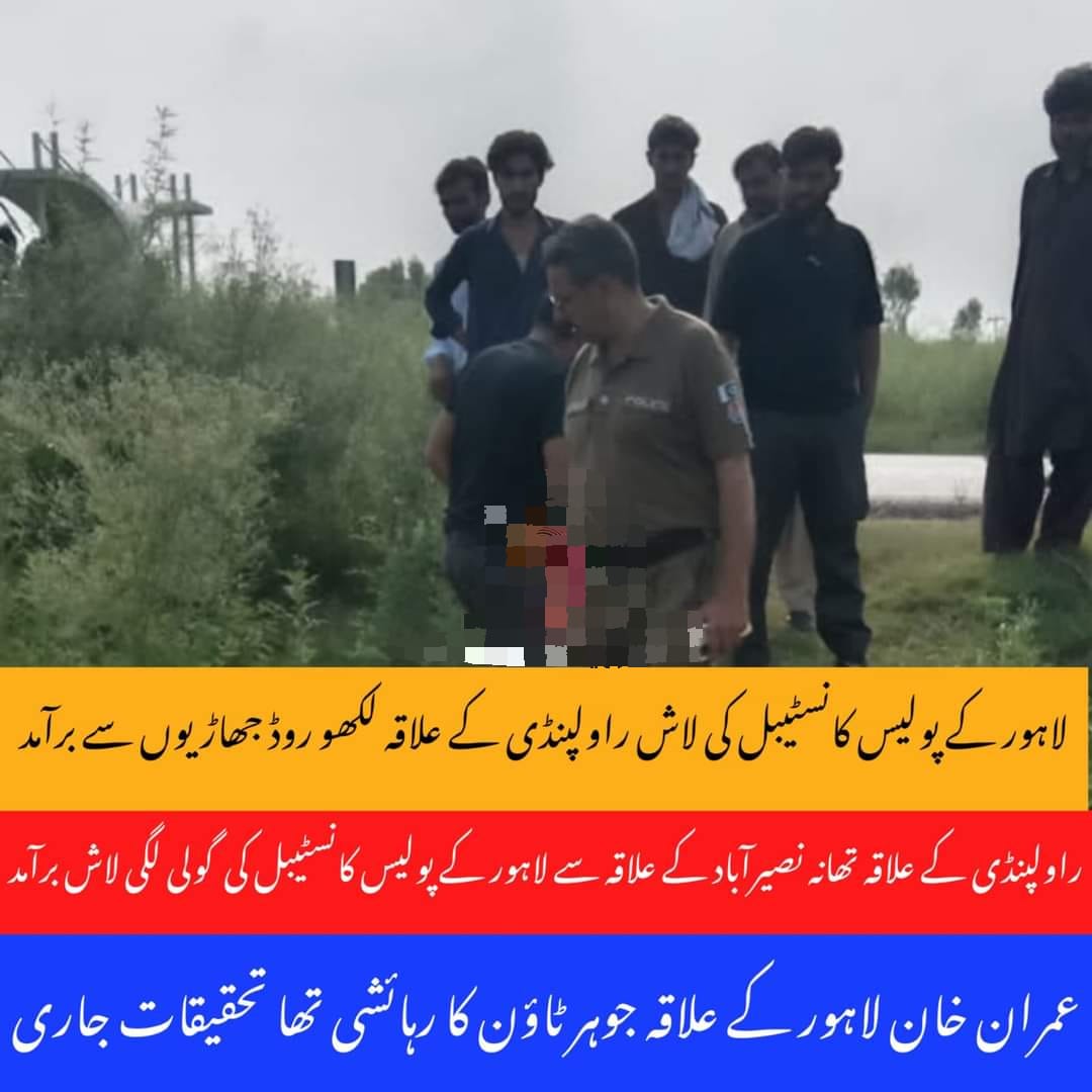 راولپنڈی تھانہ نصیر آباد کے علاقہ لکھو روڈ کی جھاڑیوں میں نامعلوم لاش برآمد ہوئی جس کی شناخت لاہور پولیس کے 35 سالہ کانسٹیبل عمران خان ولد فریاد خان کے نام سے ہوئی جو جوہر ٹاؤن کا رہائشی ہے پولیس نے لاش قبضہ میں لے کر پوسٹ مارٹم کے لئے بھجواتے تفتیش کا آغاز شروع کر دیاہے