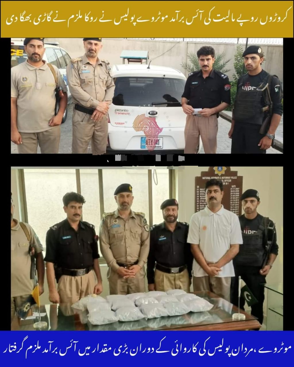 متوقع طور پر ائس پنجاب کی جانب سمگل کرنے کی کوشش کی جا رہی تھی ۔ابتدائی قانونی کاروائی مکمل کر کے گاڑی اور منشیات، تھانہ تور ضلع مردان پولیس کے حوالے ۔واضح رہے، ڈی ائی جی موٹروے نارتھ زون محمد یوسف ملک کی جانب سے مشکوک گاڑیوں پر کڑی نظر رکھنے کی ہدایت جاری تھی ۔مزید قانونی کاروائی جاری ۔