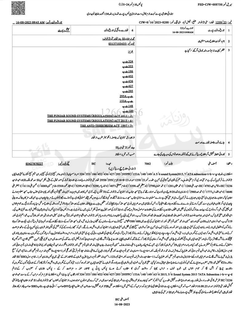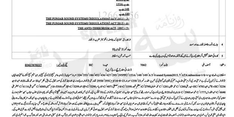 It also invoked sections 148, 149, 153A, 186, 295, 295A, 324, 353, 427, 436 and 452 of the Pakistan Penal Code (PPC). The FIR also included sections 5 and 6 of the Punjab Sound Systems (Regulation) Act 2015.