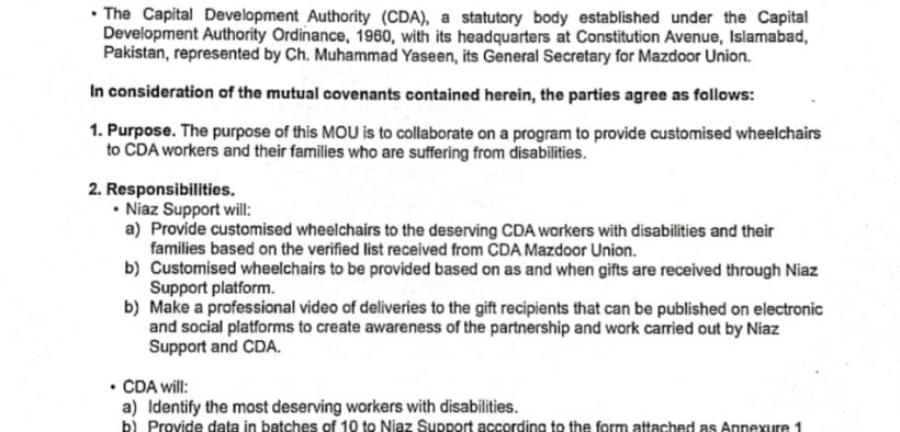 اسلام آباد(سہ پہر) معذورافراد کی مدد کے لیے سی ڈی اے مزدور یونین اور نیاز سپورٹ میں معاہدہ طے پاگیا۔