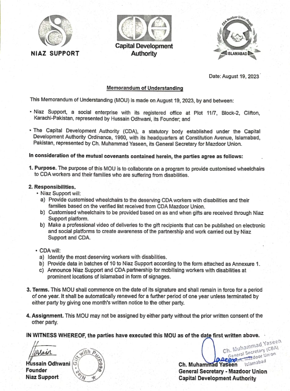 پاکستان میں معذور افراد کو مدد فراہم کر نے والے سماجی ادارے“نیاز سپورٹ ”اور سی ڈی اے مزدور یونین کے مابین معذور کارکنوں اور ان کے اہل خانہ کووہیل چیئرز فراہم کرنے کے لیے معاہدہ طے پایا ہے،ایم او یو پر نیاز سپورٹ کے بانی حسین اودھوانی اور جنرل سیکرٹری سی ڈی اے مزدور یونین و پاکستان ورکرز فیڈریشن چوہدری محمد یٰسین نے دستخط کئے،اس موقع پرنیاز سپورٹ کے بانی حسین اودھوانی نے کہاکہ ہم اپنے مستحق کارکنوں اور ان کے خاندانوں کو وہیل چیئرزفراہم کرنے کے لئے سی ڈی اے کے ساتھ شراکت پربہت خوش ہیں،یہ معاہدہ مستحق، نچلے اور متوسط طبقے کے خاندانوں کو متحرک کرنے اور ان کے گھروں میں نقل و حرکت اور خوشحالی لانے میں مدد فراہم کرے گا،سی ڈی اے مزدور یونین کے جنرل سیکرٹری چوہدری محمد یٰسین نے پاکستان میں معذور افراد کو متحرک کرنے کے لیے نیاز سپورٹ کی عظیم کوششوں کو سراہا اور حسین اودھوانی کی فراخدلانہ پیشکش کا شکریہ ادا کیا، انھوں نے کہاکہ یہ شراکت داری ہمارے کارکنوں کو معیاری خدمات فراہم کرنے کے ہمارے عزم کا ثبوت ہے، ہم نیاز سپورٹ کے تعاون کے شکر گزار ہیں اور اپنے معذور کارکنوں کی زندگیوں کو بہتر بنانے کے لئے ان کے ساتھ مل کر کام کرنے کے منتظر ہیں،وہیل چیئرز ہر وصول کنندہ کی مخصوص ضروریات کے مطابق بنائی جائیں گی اور مفت فراہم کی جائیں گی، یہ تعاون پاکستان میں معذور افراد کی زندگیوں کو بہتر بنانے کی جانب ایک اہم قدم ہے جو سب کو یکساں مواقع فراہم کرنے کے عزم کا منہ بولتا ثبوت ہے۔