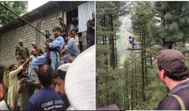 چھوٹی ڈولی سے کھانے پینے کی اشیا بھیجی جا رہی ہیں، اسی ڈولی میں ایک ایک کر کے انتہائی احتیاط کے ساتھ بچوں کو ریسکیو کیا جائے گا، پاک فوج آپریشن کیلئے شمالی علاقہ جات سے لوکل کیبل کراسنگز ایکسپرٹ لے آئی، لوکل کیبل کراسنگز ایکسپرٹ کی خدمات بھی بروئے کار لائی جا رہی ہیں۔پاشتو کے مقام پر چیئرلفٹ کی رسی ٹوٹ گئی جس کے نتیجے میں اسکول کے 6 بچوں سمیت 8 افراد 900 فٹ کی بلندی پر پھنس گئے جنہیں بچانے کے لیے ریسکیو آپریشن کئی گھنٹوں سے جاری ہے۔ تفصیلات کے مطابق بچے صبح 7 بجے کے وقت چیئرلفٹ کے ذریعے اپنے اسکول جارہے تھے کہ لفٹ کی تین میں سے دو رسیاں ٹوٹنے سے چیئرلفٹ تقریبا 900 فٹ کی بلندی پر پھنس گئی