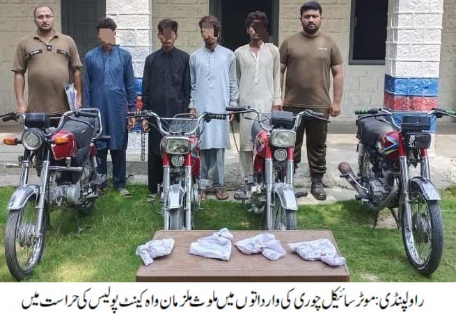 راولپنڈی(سہ پہر)ایس ایچ او واہ کینٹ عامر رفیق کی ہمراہ پولیس ٹیم موثرکاروائی، موٹر سائیکل چوری کی وارداتوں میں ملوث 04 ملزمان گرفتار