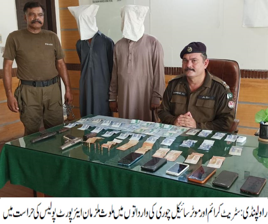 راولپنڈی(سہ پہر) ائیرپورٹ پولیس کی اہم کاروائی،سٹریٹ کرائم اور موٹر سائیکل چوری کی وارداتوں میں ملوث گینگ کا سرغنہ ساتھی سمیت گرفتار،