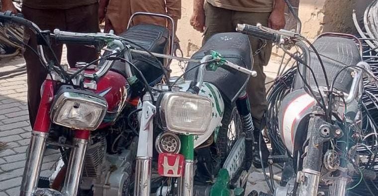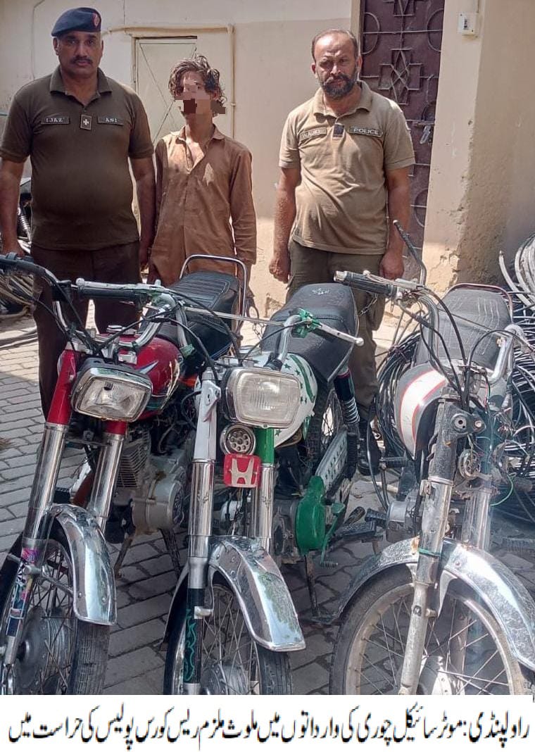موٹر سائیکل چوری کی وارداتوں میں ملوث ملزم گرفتار،چوری شدہ 03 موٹر سائیکل برآمد۔تفصیلات کے مطابق ریس کورس پولیس نے کاروائی کرتے ہوئے موٹرسائیکل چوری کی وارداتوں میں ملوث ملزم محسن کو گرفتار کر لیا،چوری شدہ 03موٹرسائیکل برآمد کر لیے،،ایس پی پوٹھوہارکا کہنا تھا کہ شہریوں کی جان ومال کی حفاظت اولین ترجیح ہے، منظم اور متحرک گینگز کے خلاف کاروائیوں میں تیزی لائی جارہی ہے۔
