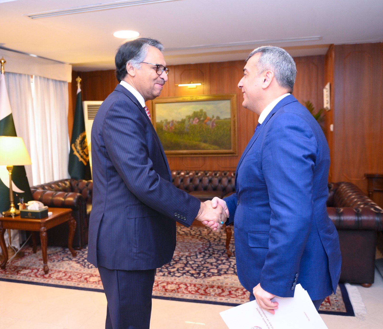 Amb of #Azerbaijan @k_farhadov called on FM @JalilJilani. Entire spectrum of bilateral relations was discussed. They noted the positive trajectory of 🇵🇰🇦🇿 relations & reiterated resolve to further cement relations with focus on trade, connectivity & ppl to ppl ties.