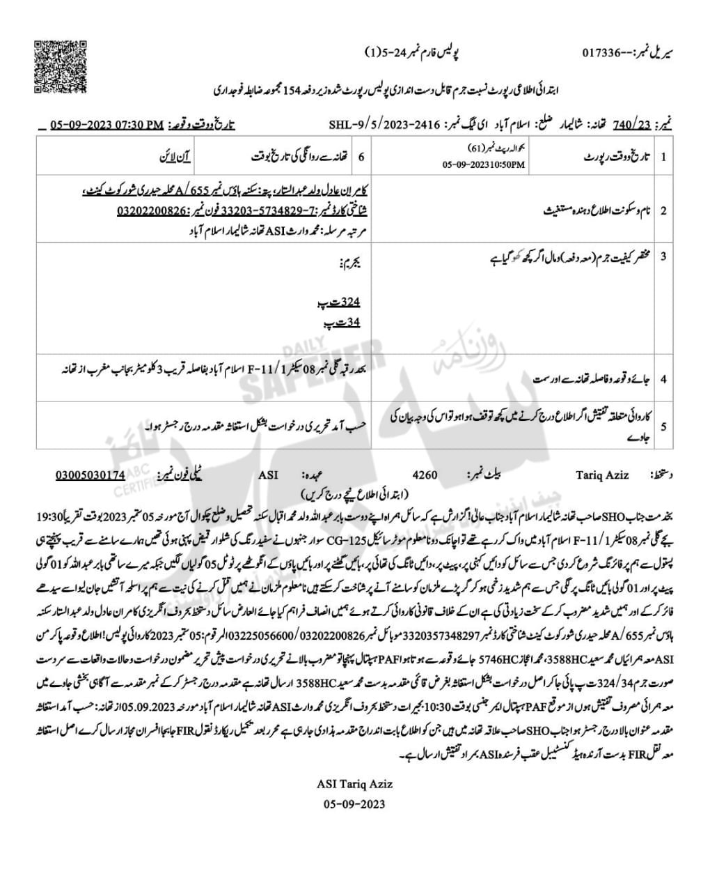Islamabad (Sapeher Times): A case of firing incident has been registered in Sector F-11 of Shalimar Police Station, Islamabad