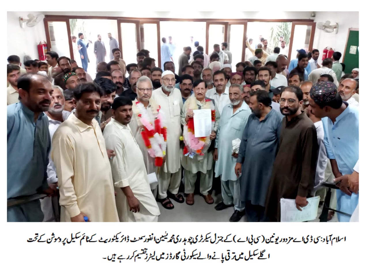 سی بی اے کمیٹی انفورسمنٹ ڈائریکٹوریٹ کے زیر اہتمام 227سیکورٹی گارڈزکی ٹائم سکیل پروموشن کے تحت بنیادی سکیل نمبرآٹھ میں ترقی پانے کے حوالے سے پروگرام منعقد ہواجس میں سی ڈی اے مزدور یونین کے جنرل سیکرٹری چوہدری محمد یٰسین،صدراورنگزیب خان،آفتاب نذر،محمد سرفراز ملک،اسدمحمود،چوہدری ابرار،سید ضمیرشاہ،راجہ اجمل،چوہدری عمران،محمد نیاز،سید جلال شاہ سمیت سینکڑوں مزدوروں نے شرکت کی،اس موقع پر مزدور یونین (سی بی اے) کے جنرل سیکرٹری چوہدری محمد یٰسین نے ترقی پانے والے تمام سیکورٹی گارڈزکو مبارکباد دیتے ہوئے کہا کہ سی ڈی اے مزدور یونین ملازمین کی نمائندہ تنظیم ہے جو رنگ،نسل اور مذہب سے بالاترہو کر محنت کشوں کی بلاتفریق خدمت پر یقین رکھتی ہے،ریفرنڈم کے دوران ملازمین نے ٹائم سکیل پروموشن کا مطالبہ کیا تھا جو کہ آج الحمد اللہ سی ڈی اے مزدور یونین نے وعدے کی تکمیل کرتے ہوئے ایک ہی آرڈر کے تحت انفورسمنٹ ڈائریکٹوریٹ کے 227سیکورٹی گارڈزکو اگلے سکیل BPS-08میں ترقی دلوائی ہے،انھوں نے کہا کہ مزدوروں کے دیگرمسائل جس میں بچوں کی بھرتی،ملازمین کے پلاٹوں کی الاٹمنٹ جیسے مطالبات کو ترجیح بنیادوں پر حل کیا جائے گا،اس موقع پر انھوں نے چیئرمین سی ڈی اے اور انتظامیہ سے مطالبہ کیا کہ مزدوروں کی نمائندہ سی بی اے یونین کے ساتھ ملازمین کے مسائل کے حل کے لیے فوری طور پر مذاکرات کیے جائیں اور چارٹرآف ڈیمانڈ پر فوری عمل درآمد کروایا جائے تاکہ ملازمین میں پائی جانے والی بے چینی کا خاتمہ ہو سکے اورادارے کا صنعتی امن قائم رہ سکے،پروگرام کے اختتام پر مزدور یونین کے ڈپٹی جنرل سیکرٹری محمد سرفرازملک نے انفورسمنٹ ڈائریکٹوریٹ کے سیکورٹی گارڈزکو اگلے سکیل میں ترقی دلوانے پر اپنے قائد چوہدری محمد یٰسین،صدراورنگزیب خان اور سی ڈی اے انتظامیہ کا خصوصی طور پر شکریہ اداکیا۔
