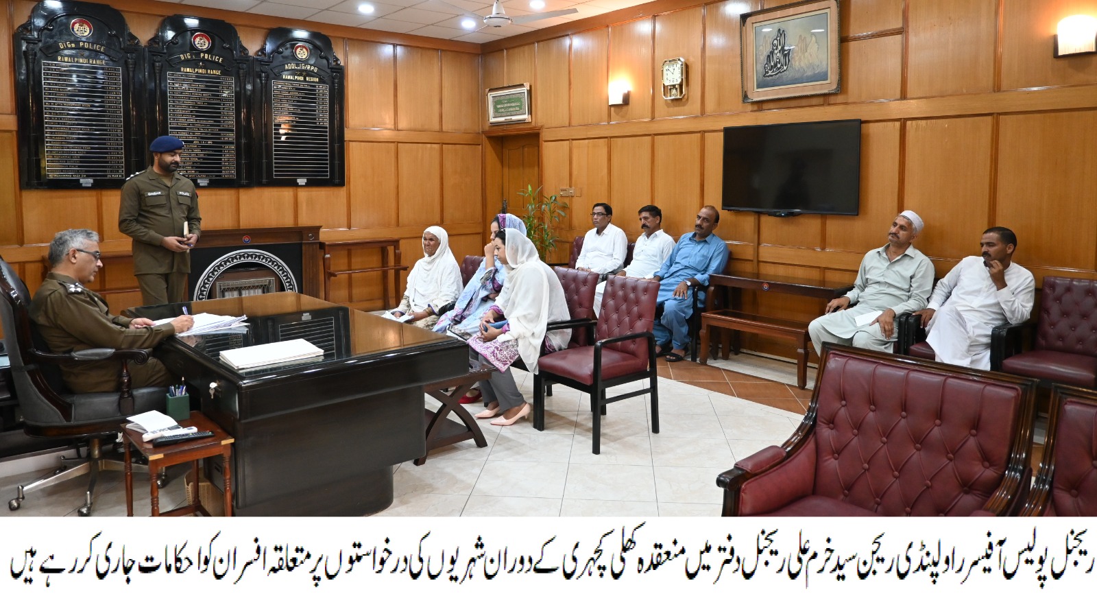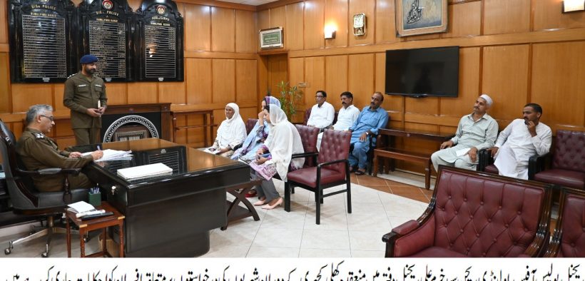 تفصیلات کے مطابق ریجنل پولیس آفیسر راولپنڈی ریجن سید خرم علی نے ریجنل دفتر میں اوپن ڈورپالیسی کے تحت کھلی کچہری کا انعقاد کیا۔کھلی کچہری میں راولپنڈی، اٹک، جہلم اور چکوال سے آئے شہریوں نے مقدمات کی تبدیلی تفتیش،ملزمان کی گرفتاری ودیگرمتفرق نوعیت کی شکایات کے متعلق درخواستیں پیش کیں جس پر آر پی او راولپنڈی ریجن نے درخواستوں پر متعلقہ افسران کو فوری انکوائری و کارروائی کے بعد مقررہ ٹائم فریم میں رپورٹ بھجوانے کے احکامات جاری کیے۔ آر پی او نے اس موقع پر گفتگو کرتے ہوئے کہاکہ