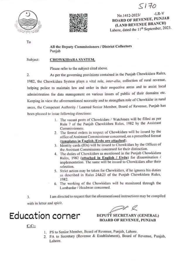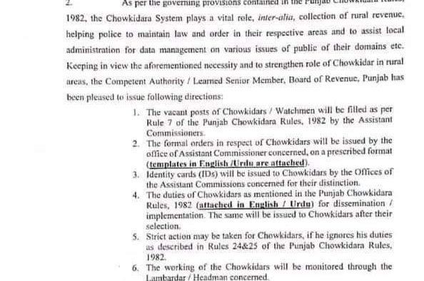 پنجاب میں چوکیداررا سسٹم کو بحال کر دیا گیا ہے اور پنجاب کے دیہاتوں میں چوکیدار رات کو پہرا بھی دیا کریں گے اور اپنے فرائض منصبی سر انجام دیں گے پنجاب کے تمام ڈپٹی کمشنر کو مراسلہ جاری کر دیا گیا ہے اور جن دیہاتوں میں چوکیداروں کی سیٹیں خالی ہیں وہاں پر نئے چوکیدار رکھے جائیں گے. اور ان کی نگرانی گاؤں کے نمبردار صاحب کریں گے. بورڈ اف ریونیو پنجاب لینڈ ریونیو. ذرائع