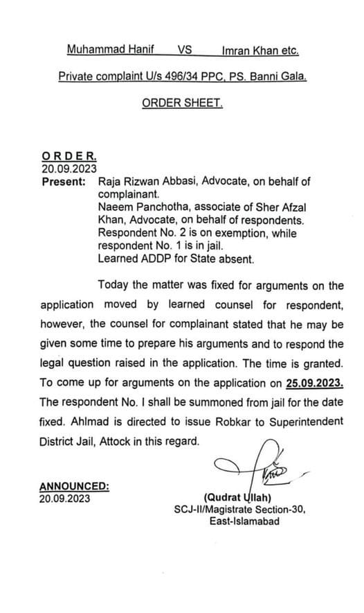 A district and sessions court in Islamabad issued a summon of Pakistan Tehreek-e-Insaf (PTI) Chairman and former Prime Minister Imran Khan for September 25 in an “unIslamic nikah” case with his third wife Bushra Bibi.