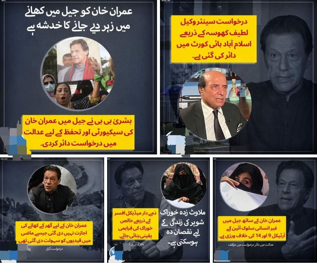 سابق وزیرِ اعظم اور پاکستان تحریک انصاف کے چیئرمین عمران خان کی اہلیہ بشریٰ بی بی نے اسلام آباد ہائی کورٹ میں ایک درخواست دائر کی ہے جس میں مؤقف اختیار کیا گیا ہے کہ خدشہ ہے کہ عمران خان کو جیل میں کھانے میں زہر دیا جاسکتا ہے۔ درخواست میں مزید کیا کہا گیا ہے؟ جانیے ان گرافکس میں۔