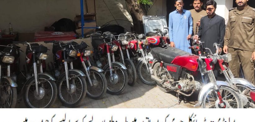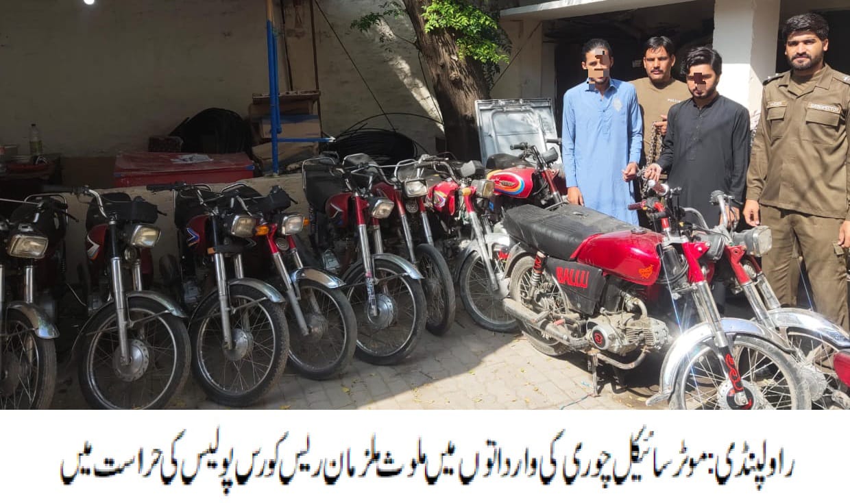 ایس ایچ او تھانہ ریس کورس راجہ افتخار کی ہمراہ پولیس ٹیم موثر کاروائی، موٹرسائیکل چوری کی وارداتوں میں ملوث 02ملزمان گرفتار، چوری شدہ 12 موٹرسائیکل برآمد۔تفصیلات کے مطابق ریس کورس پولیس نے کاروائی کرتے ہوئے موٹر سائیکل چوری کی وارداتوں میں ملوث 02ملزمان کو گرفتار کر لیا،گرفتار ملزمان میں تیموراعجازاورمحمد وقارشامل ہیں،ملزمان سے چوری شدہ 12موٹرسائیکل برآمد ہوئے،ایس پی پوٹھوہار محمد وقاص خان نے ریس کورس پولیس کو شاباش دیتے ہوئے کہا کہ گرفتار ملزمان کو ٹھوس شواہد کے ساتھ چالان کر کے قرار واقعی سزا دلوائی جائے گی،شہریوں کو انکے قیمتی اثاثے سے محروم کرنے والے قانون کی گرفت سے نہیں بچ سکتے۔
