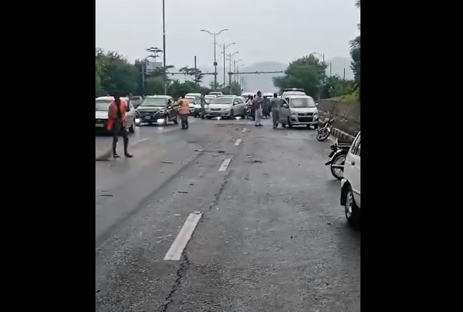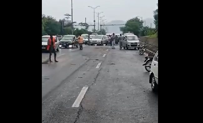 نائینتھ ایونیو پر 30 سے زاہد گاڑیاں آپس میں ٹکرا گئیں ، موقعہ پر موجود شہری کے مطابق روڈ پر کوئی لیس دار مادہ گرا ھوا ھے جس کی وجہ سے گاڑیوں کی بریک نہیں لگی اور آپس میں ٹکرا گئی۔