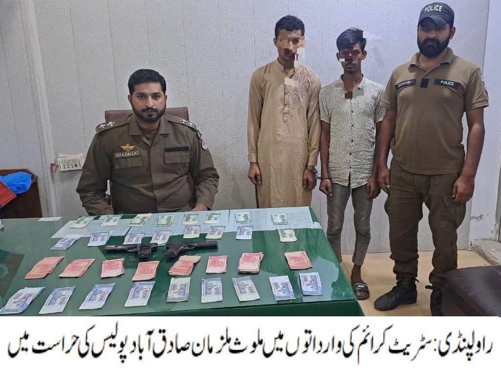 ایس ایچ او صادق آباد راجہ گلتاج کی ہمراہ پولیس ٹیم کاروائی، سٹریٹ کرائم کی وارداتوں میں ملوث 02ملزمان گرفتار، مسروقہ رقم 27ہزار 700روپے اوروارداتوں میں استعمال ہونے والا اسلحہ برآمد۔تفصیلات کے مطابق صادق آباد پولیس نے کاروائی کرتے ہوئے سٹریٹ کرائم کی وارداتوں میں ملوث 02ملزمان عبداللہ اوراحمد اقبال کو گرفتارکرلیا، ملزمان سے مسروقہ رقم 27ہزار 700روپے اوروارداتوں میں استعمال ہونے والا اسلحہ برآمد ہوا، ایس پی راول فیصل سلیم نے صادق آباد پولیس کو شاباش دیتے ہوئے کہاکہ گرفتار ملزمان کو ٹھوس شواہد کے ساتھ چالان کرکے قرار واقعی سزا دلوائی جائے گی، شہریوں کی جان ومال پر حملہ کرنے والے ملزمان قانون کی گرفت سے نہیں بچ سکتے۔