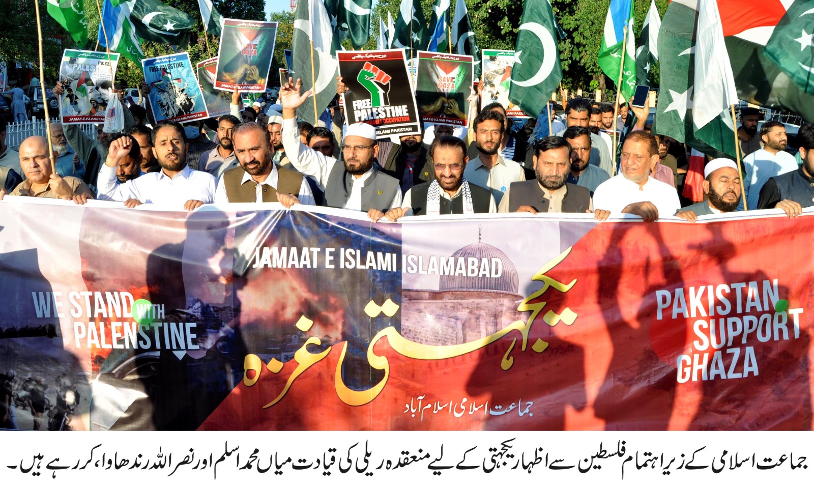 جماعت اسلامی اسلام آباد کے زیر اہتمام اہل فلسطین کے ساتھ اظہار یکجہتی اور اسرائیلی مظالم کے خلاف آبپارہ چو ک اسلام آباد میں عظیم الشان یکجہتی غزہ جلسہ عام منعقد ہوا، جس میں بڑی تعداد میں مر دو خواتین اور بچوں نے شر کت کی ،مظاہرین نے پاکستان اور فلسطین کے جھنڈے اورکتبے اُٹھا رکھے تھے ، جس پر اسرائیل اور مغر بی ممالک کے خلاف نعرے درج تھے، جلسہ عام سے نائب امیر جماعت اسلامی پاکستان میاں محمد اسلم ، امیر جماعت اسلامی اسلام آباد نصر اللہ رند ھاوا،نائب امیر محمد کاشف چوہدری ، زبیر صفدر، اسلامی جمعیت طلبہ اسلام آباد کے ناظم اسد اللہ اعوان اور دیگر نے خطاب کیا ۔