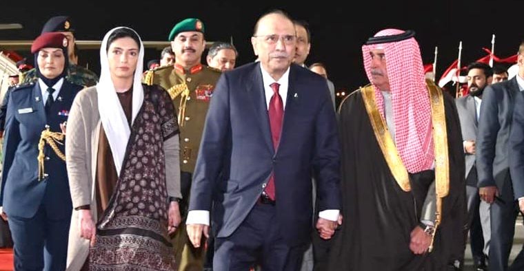 صدر مملکت آصف علی زرداری کا بحرین نیشنل گارڈ کے کمانڈر شیخ محمد بن عیسیٰ الخلیفہ اور بحرین کے وزیر خارجہ نے استقبال کیا، صدر آصف زرداری کی بحرین کے فرمانروا شاہ حمد بن عیسیٰ الخلیفہ اور ولی عہد و وزیر اعظم شہزادہ سلمان بن حمد الخلیفہ سے ملاقات متوقع ہے۔