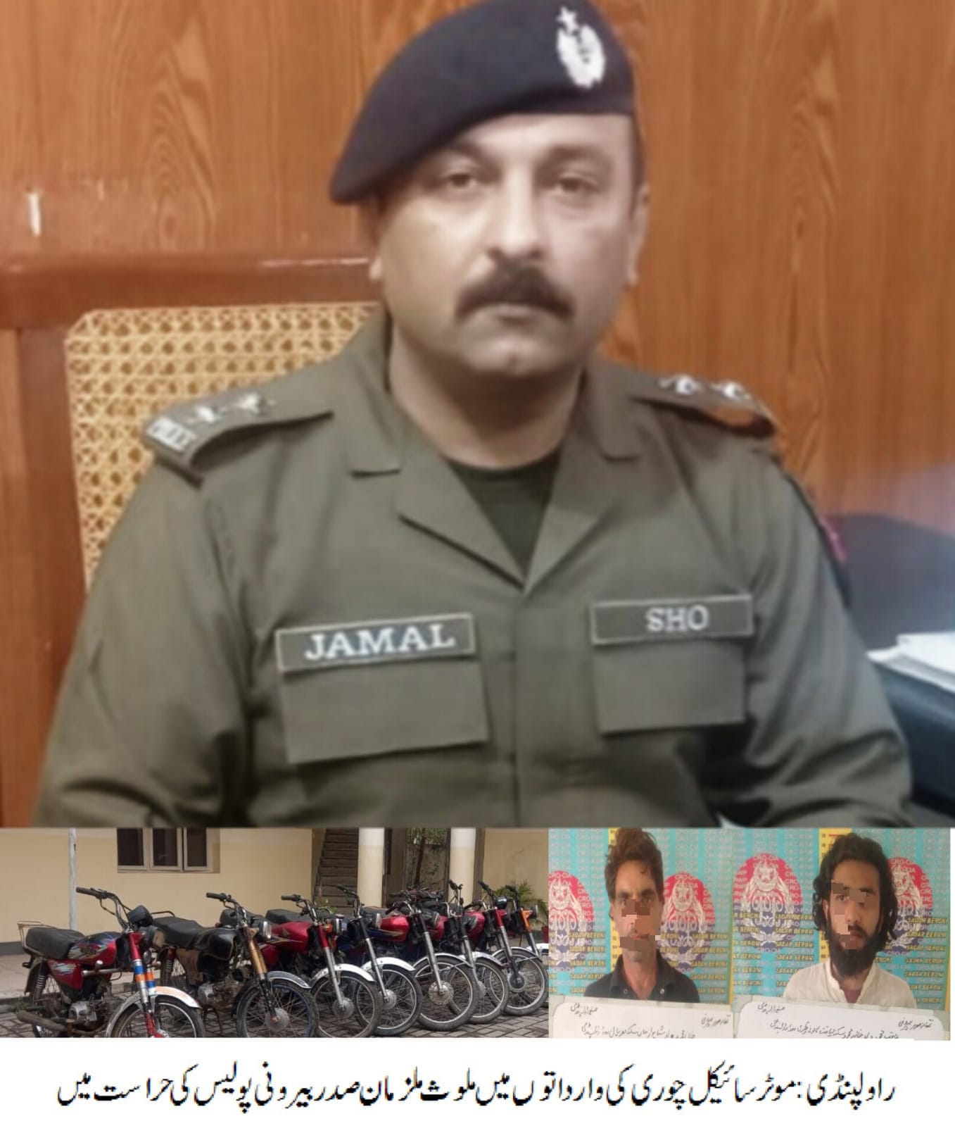 ایس ایچ او تھانہ صدربیرونی جمال نواز کی موثر کاروائی، موٹرسائیکل چوری کی وارداتوں میں ملوث 02 ملزمان گرفتار، چوری شدہ 08 موٹرسائیکل برآمد۔تفصیلات کے مطابق ایس ایچ او صدر بیرونی نے ہمراہ پولیس ٹیم کاروائی کرتے ہوئے موٹرسائیکل چوری کی وارداتوں میں ملوث 02ملزمان کو گرفتار کرلیا، گرفتار ملزمان میں عاقب اور خان محمد شامل ہیں،ملزمان سے چوری شدہ08موٹرسائیکل برآمد ہوئے،ایس پی صدر محمد نبیل کھوکھر نے صدر بیرونی پولیس کو شاباش دیتے ہوئے کہاکہ گرفتار ملزمان کو ٹھوس شواہد کے ساتھ چالان کیا جائے گا،شہریوں کو انکے اثاثے سے محروم کرنے والے قانون کی گرفت سے نہیں بچ سکتے۔