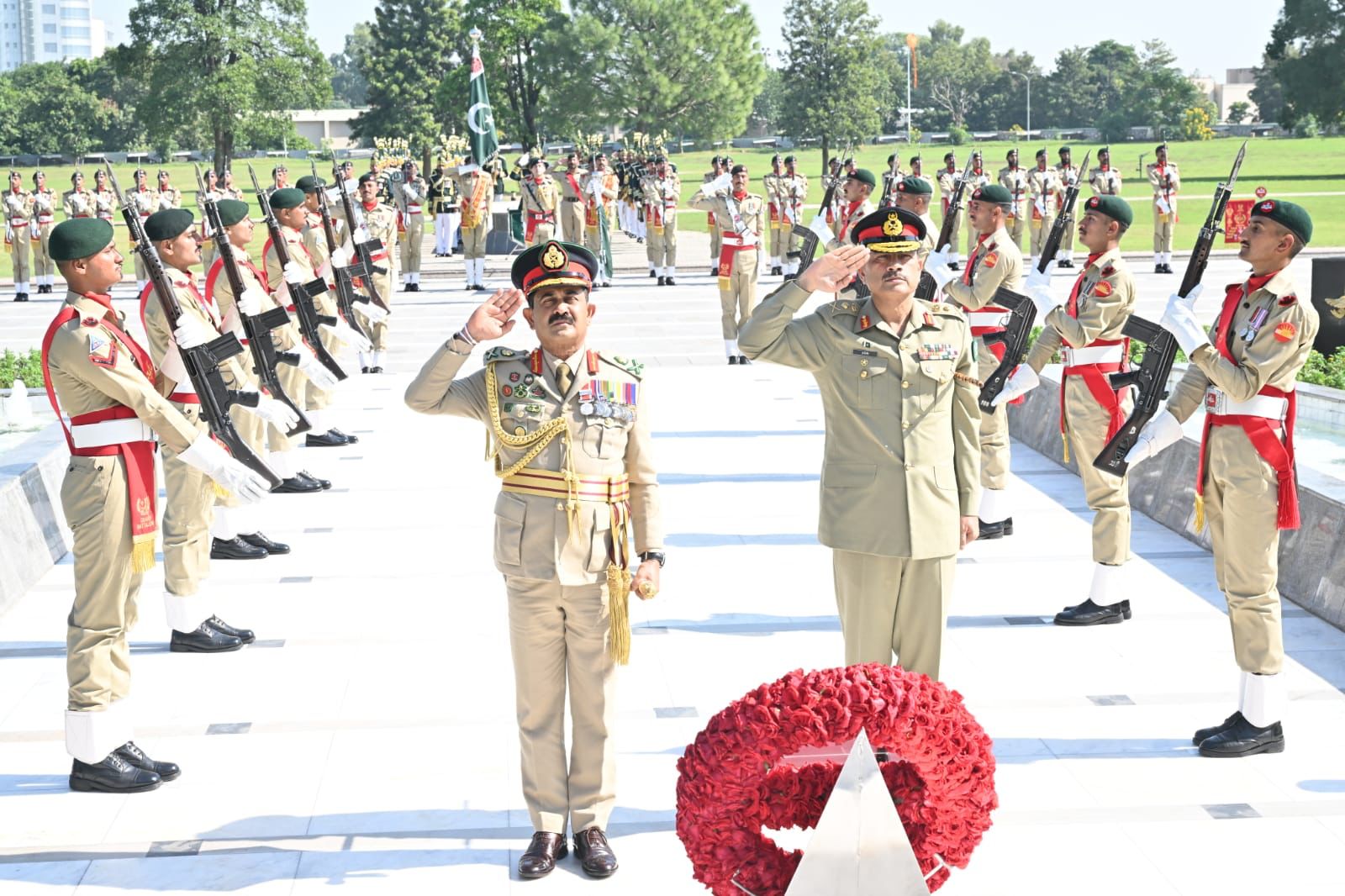 قبل ازیں جی ایچ کیو آمد پر سری لنکن آرمی کے کمانڈر نے یادگار شہدا پر پھول چڑھاۓ۔ پاک فوج کے چاق و چوبند دستے نے معزز مہمان کو گارڈ آف آنر بھی پیش کیا۔