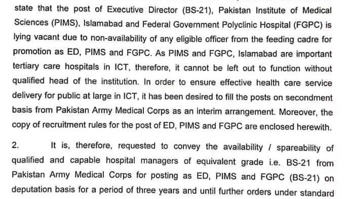 پاکستان تازہ ترین اسلام آباد(سہ پہر) نگران حکومت کا وفاقی دارالحکومت کے دونوں بڑے ہسپتال (پمز اور پولی کلینک) فوج کے حوالے کرنے کا فیصلہ admin 2023-10-29 اسلام آباد نگران حکومت کا وفاقی دارالحکومت کے دونوں بڑے ہسپتال (پمز اور پولی کلینک) فوج کے حوالے کرنے کا فیصلہ وزارت دفاع دونوں انتظامی افسران کی تعیناتی کیلئے افسران نامزد کرے گی
