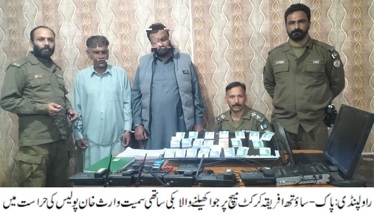 راولپنڈی(سہ پہر) وارث خان پولیس کی کارروائی،پاک-ساؤتھ افریقہ کرکٹ میچ پر جوا کھیلنے والا بکی ساتھی سمیت گرفتار