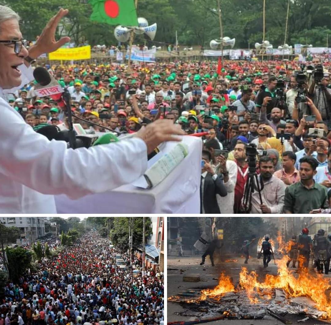 بنگلہ دیش نیشنل پارٹی، بی این پی نے وزیر اعظم شیخ حسینہ کی حکومت کے خلاف بڑے پیمانے پر مظاہرے کے بعد آج اتوار کو ملک گیر عام ہڑتال کا اعلان کیا۔ ہفتے کے روز احتجاج کے دوران پرتشدد جھڑپیں ہوئیں، جس میں 100,000 سے زیادہ اپوزیشن کے حامی دارالحکومت ڈھاکہ میں جمع ہوئے۔