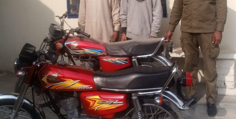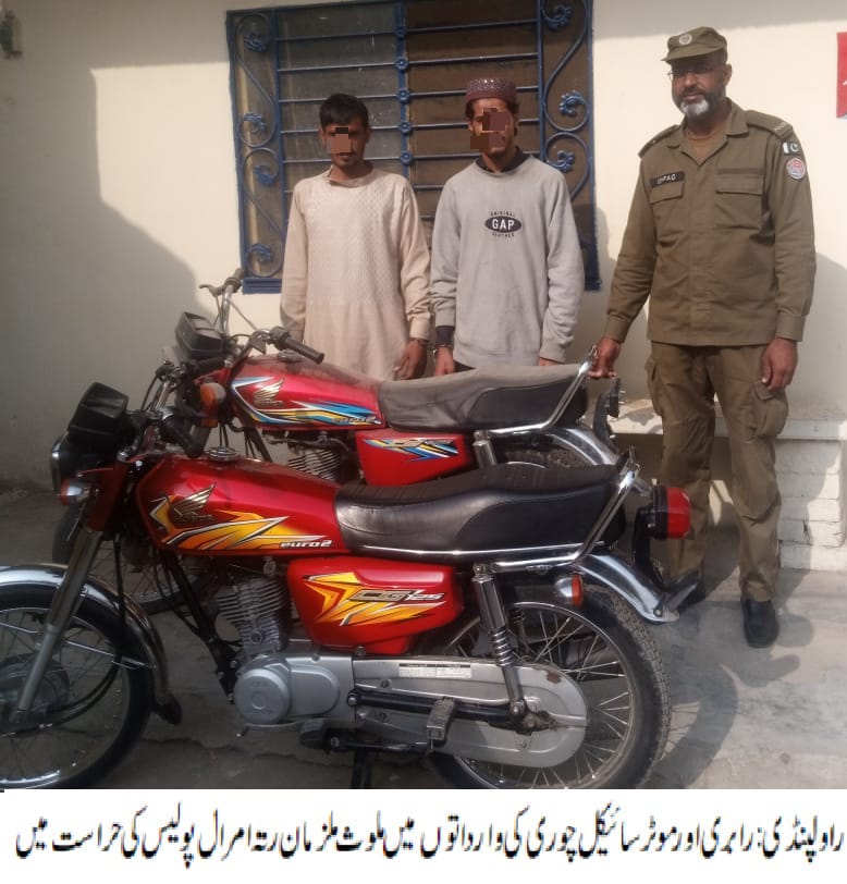 راولپنڈی ( )ایس ایچ او رتہ امرال چوہدری ریاض کی ہمراہ پولیس ٹیم کاروائی، رابری اورموٹرسائیکل چوری کی وارداتوں میں ملوث02ملزمان گرفتار، چھینا گیاموٹرسائیکل اور چوری شدہ موٹرسائیکل برآمد۔تفصیلات کے مطابق رتہ امرال پولیس نے کاروائی کرتے ہوئے رابری اورموٹرسائیکل چوری کی وارداتوں میں ملوث 02ملزمان محمد سجاد اورلطیف کو گرفتارکرلیا، ملزمان سے چھینا گیا موٹرسائیکل اورچوری شدہ موٹرسائیکل برآمد ہوا، ایس پی راول فیصل سلیم کا کہناتھاکہ موٹرسائیکل چوری کی روک تھام کے لیے موثر اقداما ت کیے جارہے ہیں۔