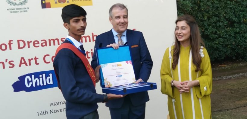 ایف ایٹ تھری سکول براۓ طلباء کے ہونہار طالبِ علم احمد حسن نے قومی کمیشن براۓ حقوقِ بچہ کے زیرِ نگرانی ہونے والے تین سو طلباء طالبات کے مابین پینٹنگز مقابلے میں سے دوسری پوزیشن حاصل کی۔ 14 نومبر کو اسپین کی ایمبیسی نے بطور مہمان دعوت دی اور اسپین کے سفیر نے احمد حسن کو تعریفی سند اور شیلڈ سے نوازا۔ اس موقع پر سینیٹر عاٸشہ رضا فاروق اور فرحت اللہ بابر کے علاوہ نجی و سرکاری اداروں کے بچے بھی موجود تھے۔