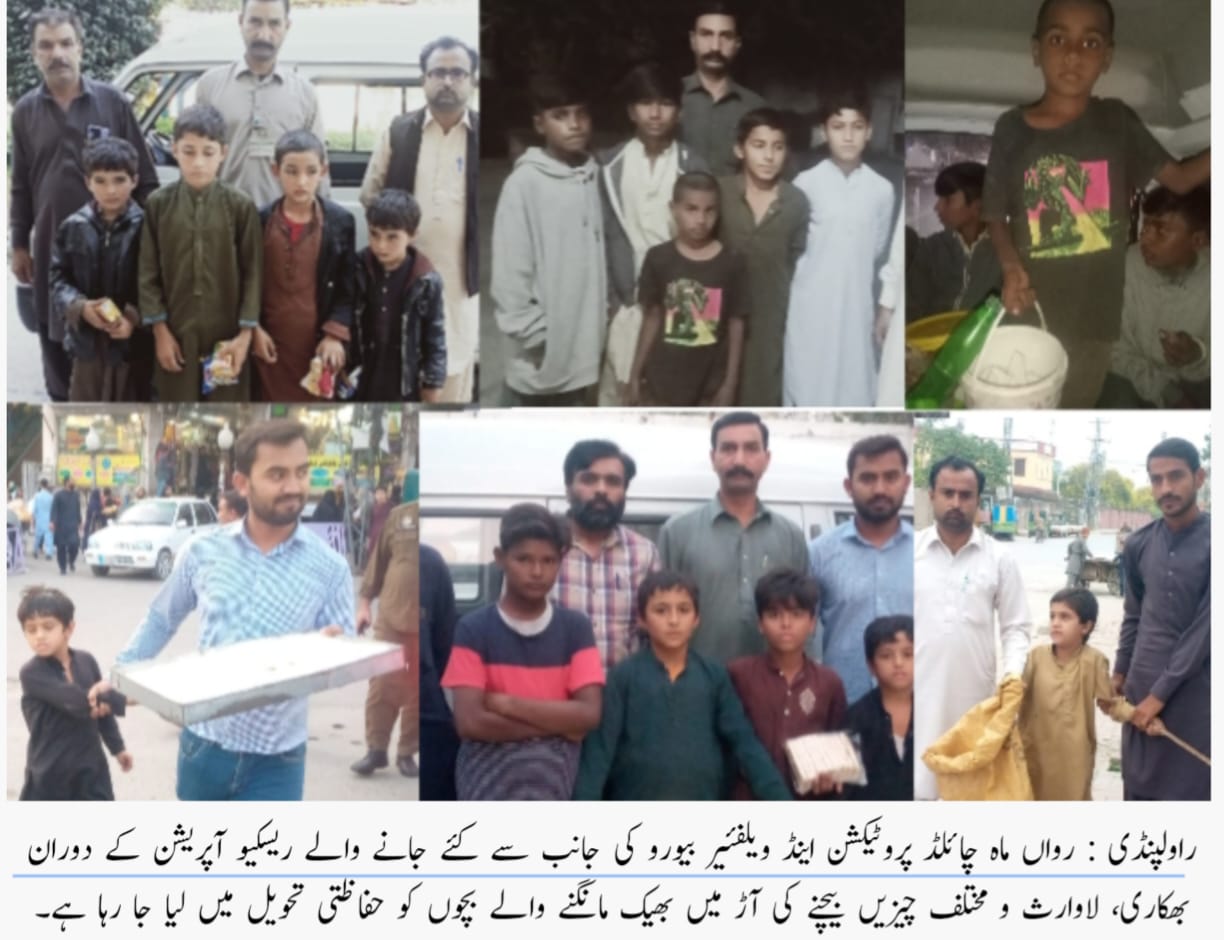 علی عابد نقوی نے بتایا کہ بھکاری بچوں کو حفاظتی تحویل میں لینے کے لئے روزانہ کی بنیاد پر شیڈول کے مطابق ریسکیو آپریشن جاری ہیں ۔۔۔ ڈسٹرکٹ آفیسر کے مطابق رواں سال جنوری سے اب تک راولپنڈی سے کُل 788 بچوں کو حفاظتی تحویل میں لیا گیا ہے اب بھی چائلڈ پروٹیکشن بیورو راولپنڈی کی تحویل میں 71 بچے موجود ہیں جن کو مکمل تحفظ، رہائش، خوراک و لباس، تعلیم و ہنر، دینی تعلیم، نفسیاتی وطبی اور تفریحی سہولیات بہم پہنچائیں جا رہی ہیں ۔۔۔