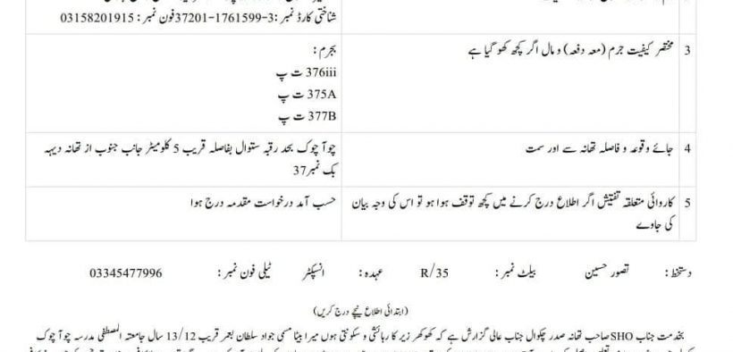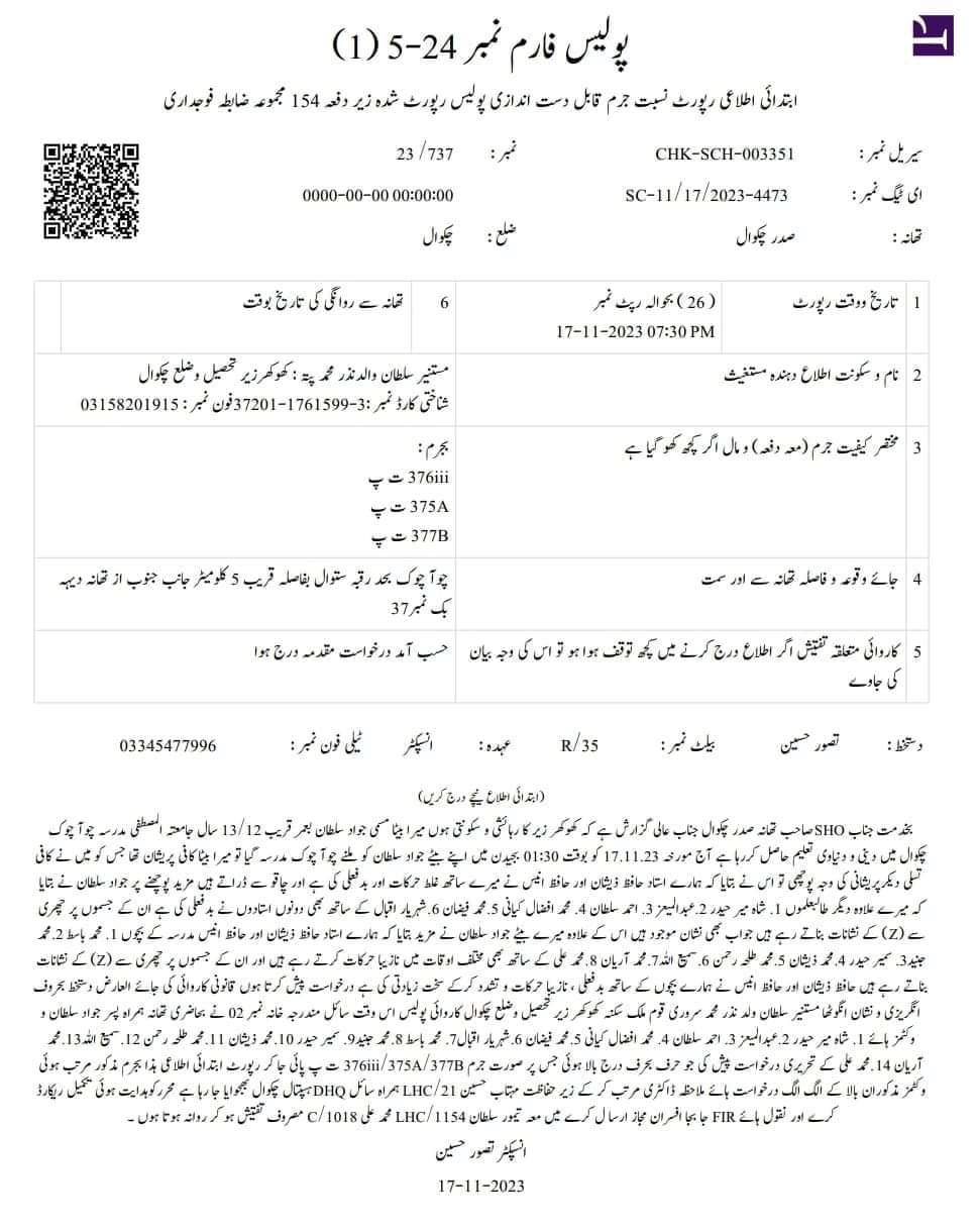 پاکستان تازہ ترین کرائم چکوال(سہ پہر) چکوال میں بے شرمی کی انتہا admin 2023-11-20 چکوال چکوال میں بے شرمی کی انتہا پندرہ بچوں سے جنسی زیادتی اور ان کے جسم پر چاقو سے اپنا نام لکھنے کے جرم میں گرفتار افراد کی تعداد چار ہوگئی، مرکزی ملزمان حافظ ذیشان،حافظ انیس کے بعد مدرسے کے پرنسپل اور ایڈمن افسر کو بھی گرفتار کرلیا گیا