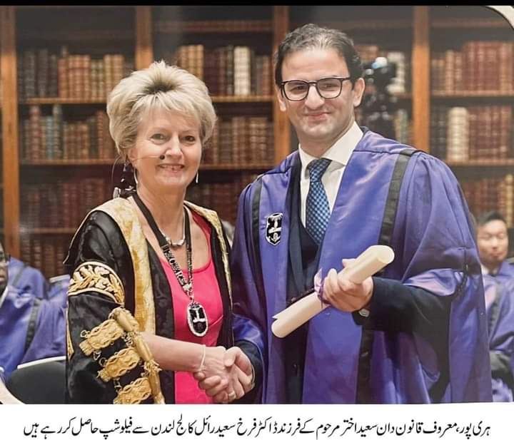 Haripur (Sapeher Times) Dr. Farrukh Saeed, the son of the late advocate Saeed Akhtar Khan, a prominent lawyer from Haripur district, was awarded a fellowship by the prestigious British institution Royal College of Physicians.