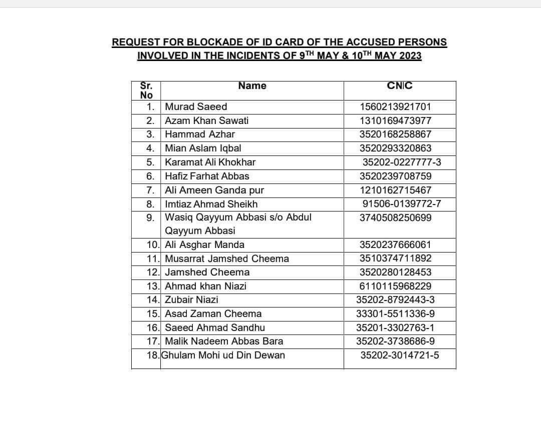 9 مئی کے 18 اشتہاریوں کے شناختی کارڈ بلاک کرانے کا فیصلہ