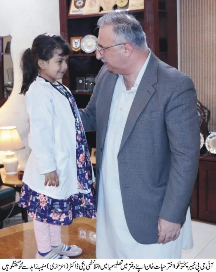 پشاور(سہ پہر) انسپکٹر جنرل آف پولیس خیبرپختونخوا اختر حیات خان نے ضلع صوابی سے تعلق رکھنے والی تھلیسمیا کی مریض 6سالہ ننھی بچی ڈاکٹر منیبہ زاہد کی آئی جی پی سے ملاقات کی خواہش پوری کرتے ہوئے انہیں آج اپنے دفتر میں مدعو کیا۔