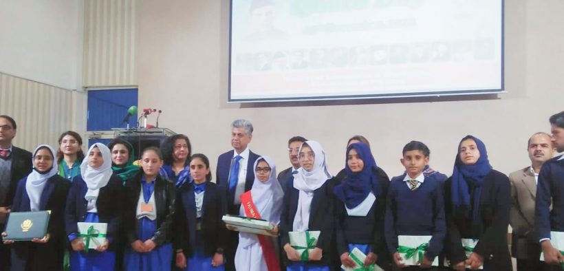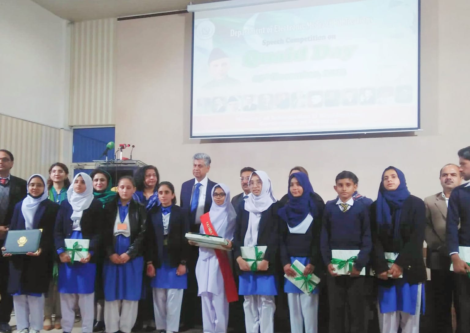 اسلام آباد: ڈاریکٹوریٹ آف الیکٹرانک میڈیا اینڈ پبلیکیشنز کے زیر اہتمام فیڈرل ڈائریکٹوریٹ آف ایجوکیشن کے سکولوں کے بچوں کے مابین قائداعظم محمد علی جناح کو شاندار خراج عقیدت پیش کرنے کے لئے مثالی تقریری مقابلے کا انعقاد کیا گیا۔ جس میں اسلام آباد ماڈل سکول فار گرلز (VI-X) جی نائن فور کی ہو نہار طالبہ ایمن فرہان نے پہلی پوزیشن حاصل کی۔ تقریب کے مہمان خصوصی نگران فیڈرل منسٹر برائے انفارمیشن اینڈ براڈ کاسٹنگ جناب مرتضی سولنگی تھے۔ انھوں نے طالبات میں سرٹیفیکیٹ اور کیش پرائز تقسیم کئے۔ اس موقع پر ایمن فرہان نے فیڈص منسٹر برائے اطلاعات و نشریات کے ہمراہ قائداعظم محمد علی جناح کی سالگرہ کا کیک کاٹنے کا اعزاز بھی پایا۔