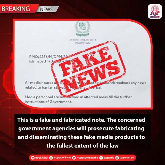 انگلش نیوز تازہ ترین Islamabad(Sapeher Times): This is a fake and fabricated note. admin 2024-01-18 This is a fake and fabricated note. The concerned government agencies will prosecute fabricating and disseminating these fake media products to the fullest extent of the law.