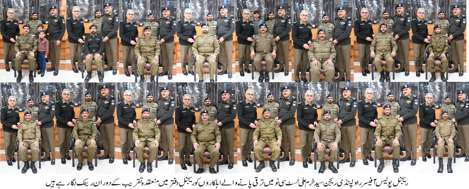 تفصیلات کے مطابق ریجنل پولیس آٖفیسر راولپنڈی ریجن سید خرم علی نے آئی جی پنجاب ڈاکٹر عثمان انورکے احکامات کے مطابق راولپنڈی ضلع کے 300پولیس کانسٹیبلان کو پروموشن لسٹ سی ٹو میں درج کرنے کے احکامات جاری کر دیئے۔ پروموشن لسٹ میں درج ہونے والے اہلکاروں کے سروس ریکارڈ، کارکردگی کی مکمل جانچ پڑتال کے بعد احکامات جار ی کیے گئے۔ ترقی پانے والے اہلکاروں کو رینک لگانے کے لیے ریجنل دفتر میں تقریب کا انعقاد کیا گیا۔اے ڈی آئی جی ملک نعیم اختر نے آر پی او راولپنڈی کے ہمراہ ترقی پانے والے اہلکاروں کو رینک لگائے۔ترقی پانے والے میں محمد نواز، طارق سلیم، تصور حسین، خلیل ابرار، محمد اشتیاق، محمد افضال، طارق محمود، محمد فردوس، محمد عمران، محمد خلیل، محمد مبشر، اشفاق احمد،شاہد اقبال، شاہد ریاض، ماجد حسین اور فدا حسین سمیت دیگر 284کانسٹیبلان شامل ہیں۔آر پی او راولپنڈی نے ترقی پانے والے اہلکاروں کو مبارکباد دیتے ہوئے نیک تمناؤں کا اظہار کیا۔ آر پی او نے ترقی پانے والے کانسٹیبلان سے گفتگو کرتے ہوئے کہا کہ آپ آئند ہ بھی مزید محنت اور جذبے کے ساتھ عوام کو بہترین خدمات کی فراہمی کا سلسلہ جاری رکھیں اور محکمہ پولیس کی مثبت شناخت کو قائم رکھنے کے لیے اپنا کردار ادا کریں گے ۔