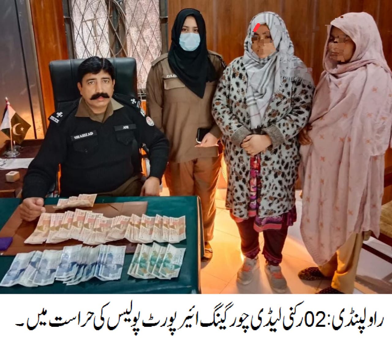 راولپنڈی(مظہر شاہ )ایس ایچ او تھانہ ائیرپورٹ حامد کاظمی کی ہمراہ پولیس ٹیم کاروائی،02رکنی لیڈی چور گینگ گرفتار، ملزمان سے مسروقہ رقم 02 لاکھ 50 ہزار روپے برآمد،ملزمان گھروں میں کام کاج کے بہانے داخل ہوکر چوری کرتی تھیں۔تفصیلات کے مطابق ائیرپورٹ پولیس نے کاروائی کرتے ہوئے 02رکنی لیڈی چور گینگ کو گرفتار کرلیا،گرفتار ملزمان میں نائلہ اور انصر بی بی شامل ہیں،ملزمان سے مسروقہ رقم 02 لاکھ 50 ہزار روپے برآمد ہوئے،ملزمان گھروں میں کام کاج کے بہانے داخل ہوکر چوری کرتی تھیں،ایس پی پوٹھوہار کا کہناتھاکہ ملزمان کو ٹھوس شواہد کے ساتھ چالان عدالت کرکے قرار واقعی سزا دلوائی جائے گی، منظم اور متحرک گینگز کے خلاف کاروائیاں جاری رہیں گی۔