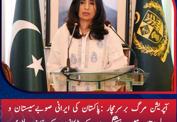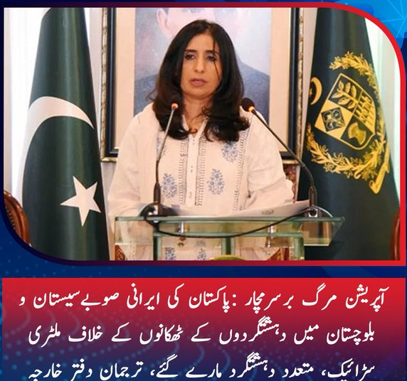 پاکستان نے جمعرات کی صبح ایران کے صوبے سیستان و بلوچستان میں انتہائی مربوط اور مخصوص اہداف کے خلاف مہارت سے فوجی کاروائیوں میں دہشت گردوں کے ٹھکانوں کو نشانہ بنایا ۔ ’’مرگ بر سرمچار ‘‘ کے نام سے خفیہ اطلاعات پر مبنی آپریشن میں متعدد دہشت گرد مارے گئے۔